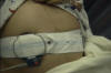 As the clocks show in the previous photo, it's been a little while since the last photo. We've gone from the 'waiting' room into the operating room. And the anesthesiologist took some time to put in the spinal tube for her epidural. |
